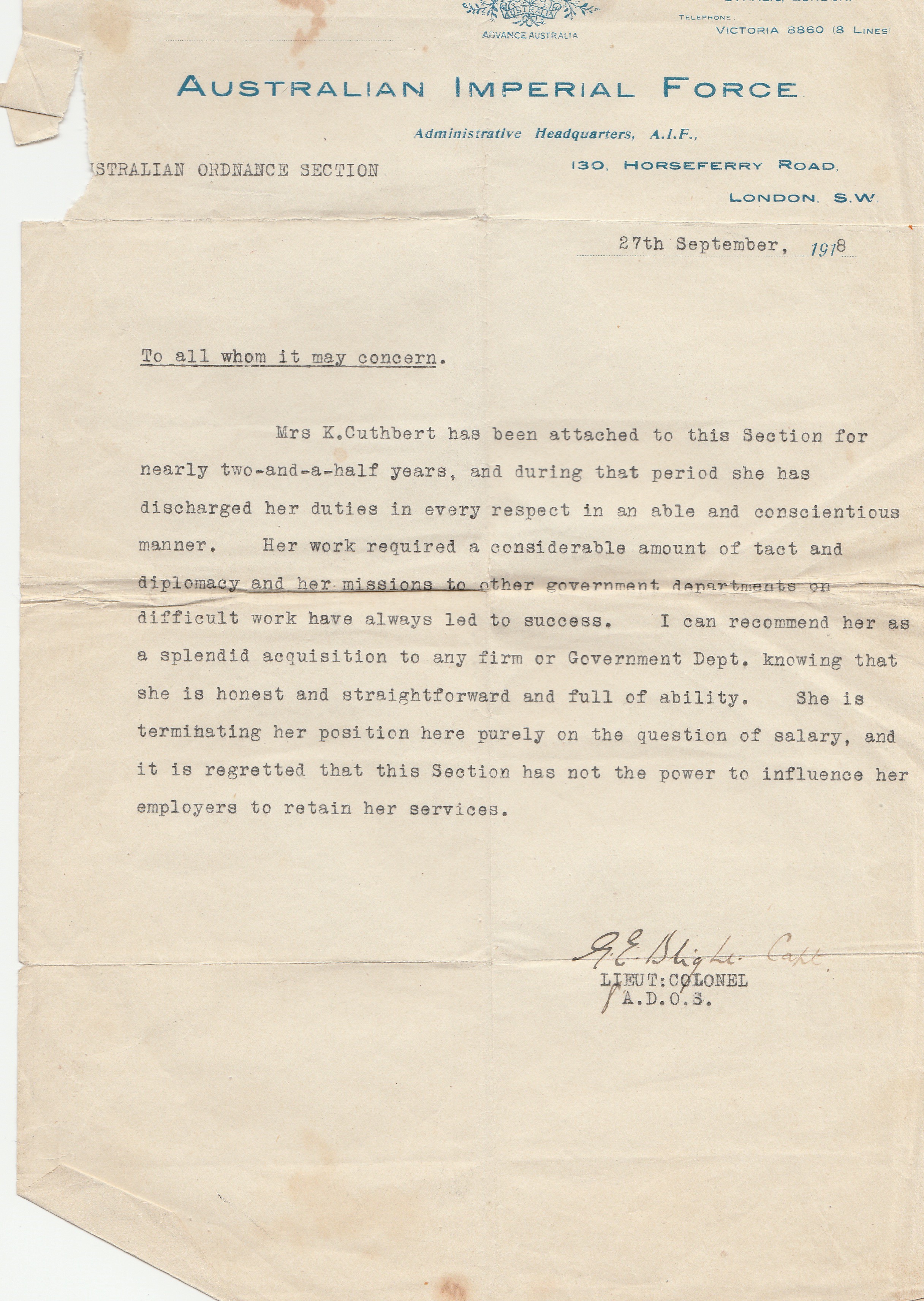 Mrs. K Cuthbert has been attached to this Section for nearly two-and-a-half years, and during that period she has discharged her duties in every respect in an able and conscientious manner. Her work required a considerable amount of tact and diplomacy and her missions to other government departments on difficult work have always led to success. I can recommend her as a splendid acquisition to any firm or Government Dept. knowing she is honest and straight-forward and full of ability. She is terminating her position here on the question of salary, and it is regretted that this Section has not the power to influence her employers to retain her services.
